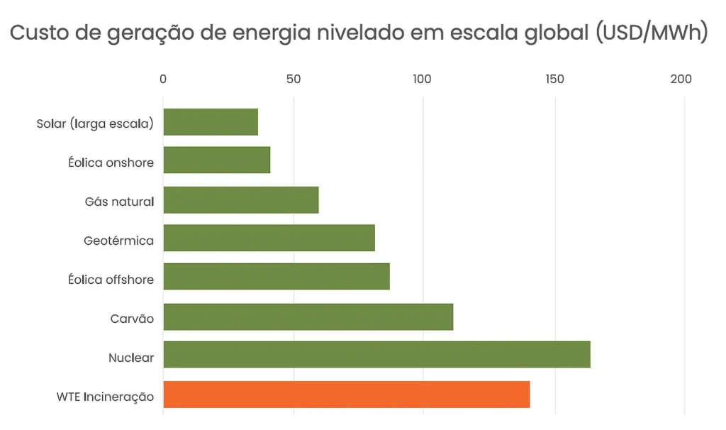 Os números do estudo evidenciam que a incineração aumenta o custo da energia elétrica para os consumidores. De acordo com dados globais, é uma das formas mais caras de se gerar energia, com custos quase quatro vezes maiores do que a energia solar e eólica, mais que o dobro do gás natural e 25% superiores aos da energia a carvão.