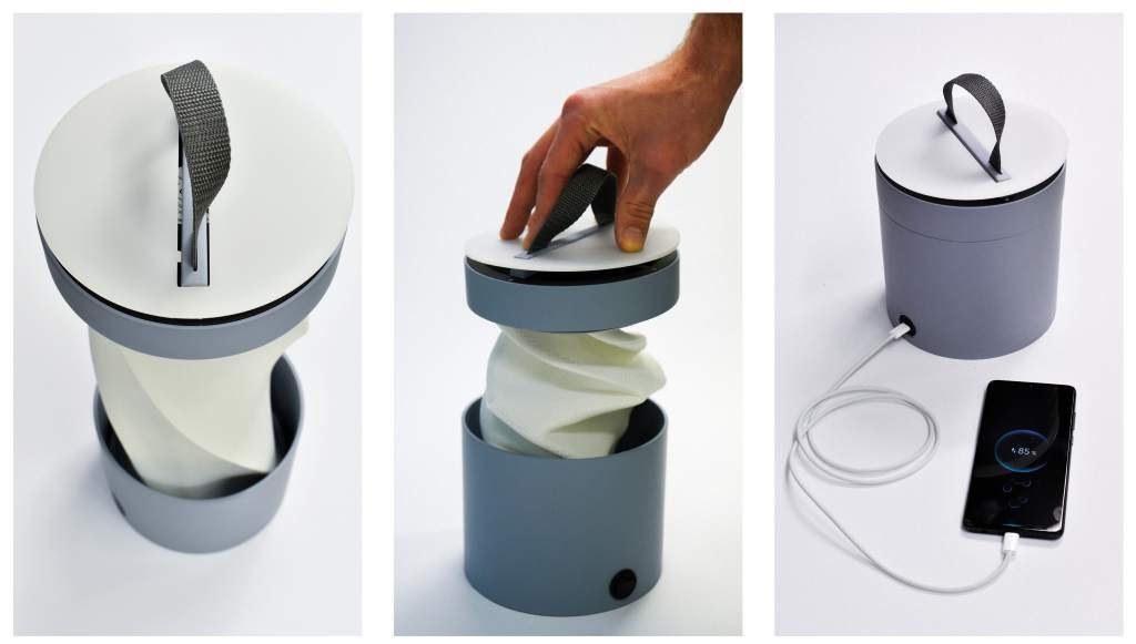 Na parte superior do dispositivo, um ventilador axial de baixa voltagem — semelhante ao usado em computadores — suga o ar quente e o direciona para um tecido tridimensional embebido em água. Esse tecido é conectado a um reservatório que o mantém constantemente úmido, graças a um sistema de alças metálicas giratórias que mergulham e tensionam a superfície.